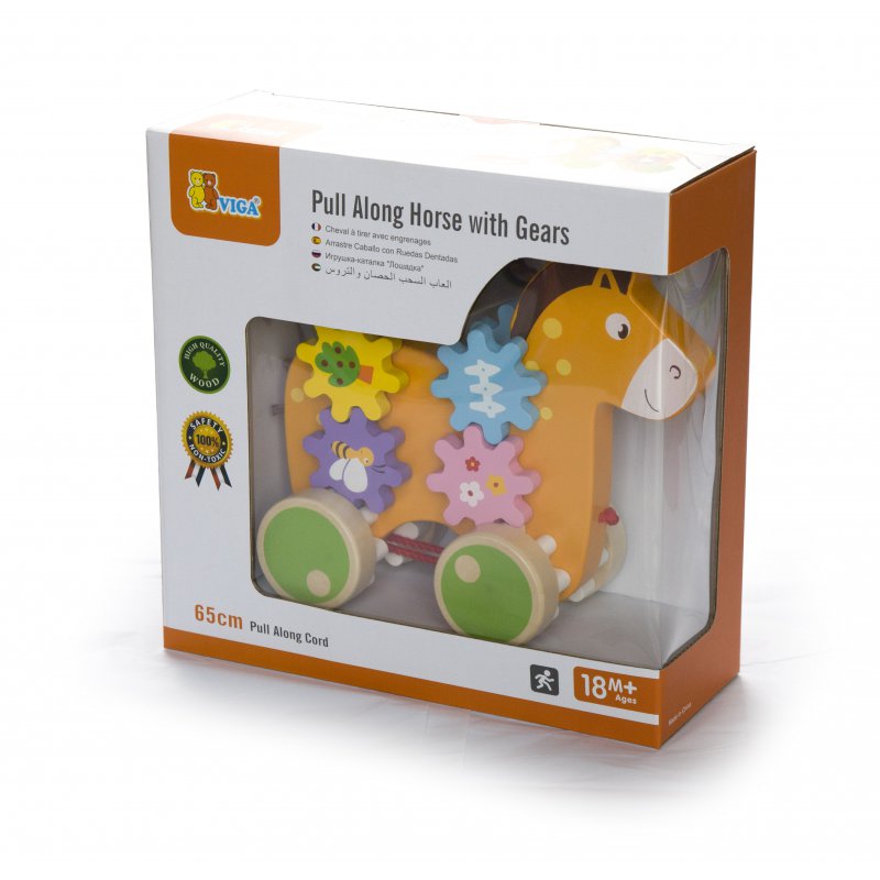 Wspaniały drewniany konik na kółkach, z którym Twoje dziecko nie będzie potrafiło się rozstać. Konik jest niezwykły, bo posiada koła zębate z kolorowymi obrazkami, które połączone są z kółkami i obracają się podczas jazdy.