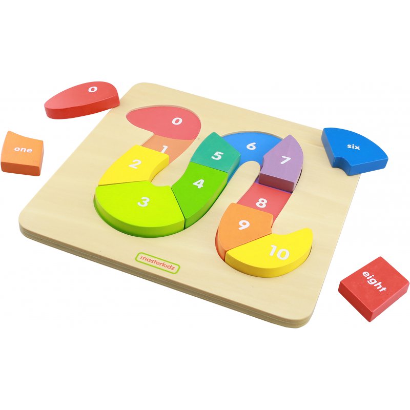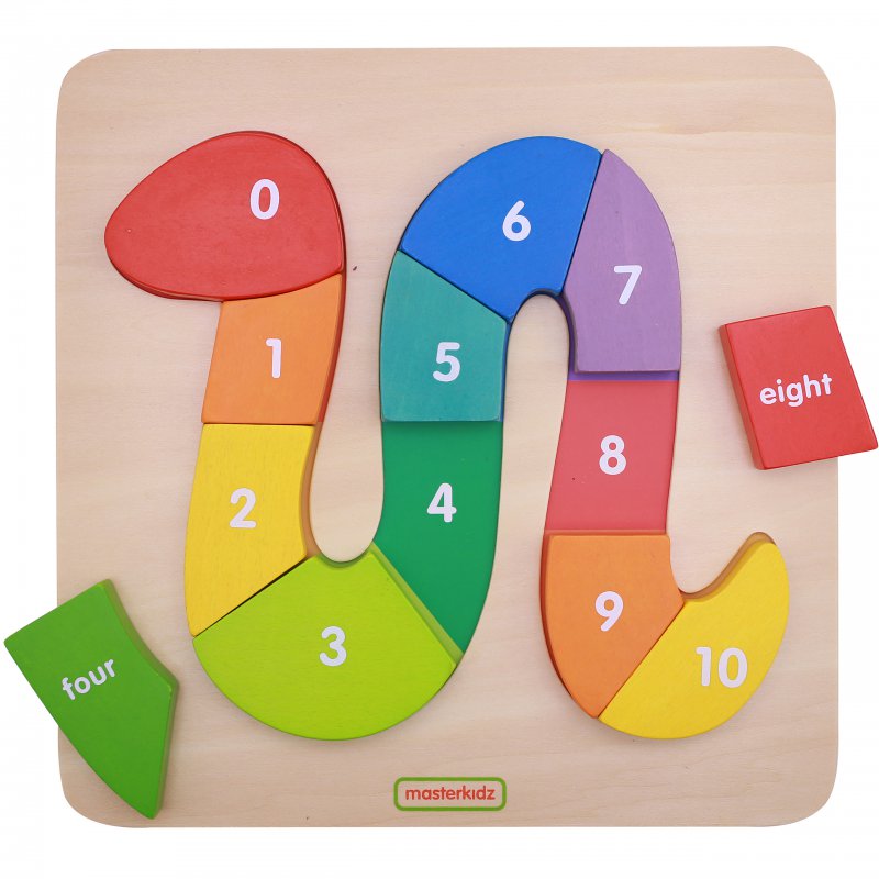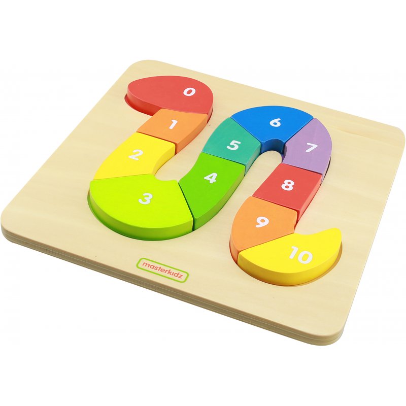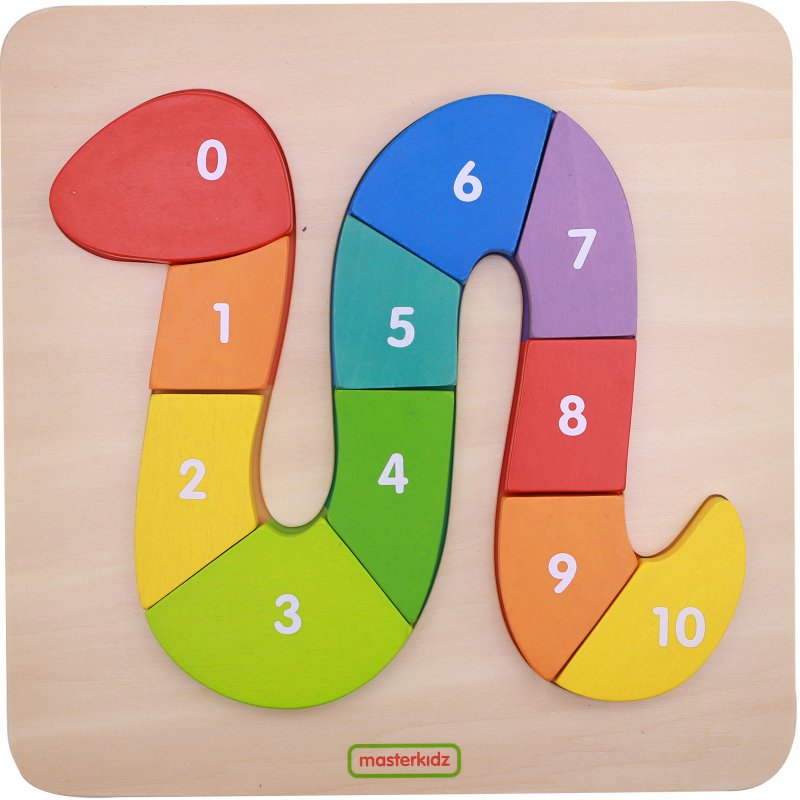 Edukacyjna zabawka sensoryczna dla dzieci marki Masterkidz, dzięki której w prosty i sympatyczny sposób maluch nauczy się liczenia do 10, oraz cyferek. Zabawka składa się z drewnianej planszy, na której znajduje się kolorowe pole, w którym należy ułożyć węża z dostępnych klocków podpisanych cyferkami 0-10. Zadaniem dziecka jest ułożenie klocków po kolei, od najmniejszej do największej liczby.