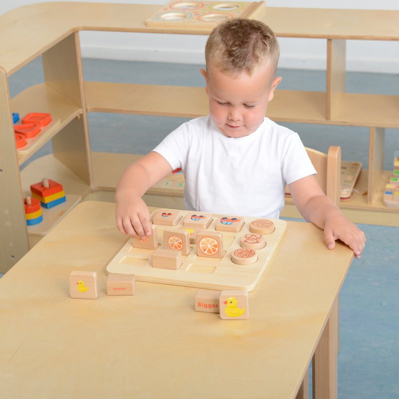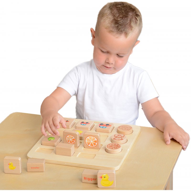 We wczesnej edukacji dzieci uczą się bardzo wielu rzeczy. Dla dorosłych mogą się wydawać mało znaczące, ale dla gwałtownie rozwijających się umysłów maluchów są bardzo ważne. Edukacyjna tabliczka drewniana do sortowania i grupowania obiektów jest świetną pomocą, dzięki której maluchy nauczą się rozróżniać wielkości przedmiotów. Prosta zabawa stymuluje logiczne myślenie, oraz pomaga w nauczeniu się sortowania schematami.