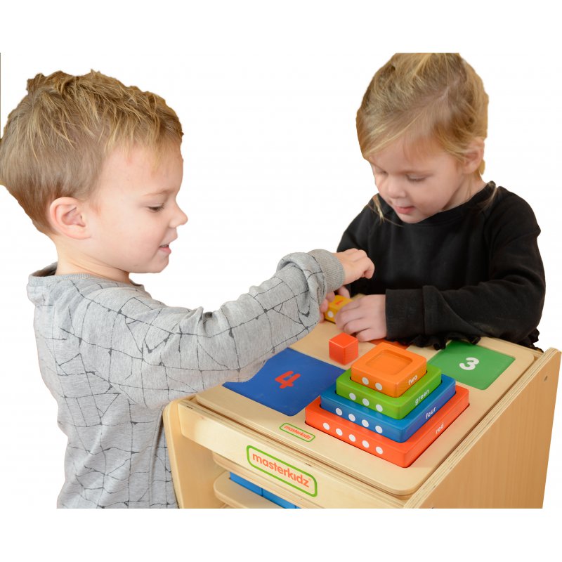 Bardzo pomysłowa zabawka edukacyjna marki Masterkidz, która posiada wiele wspaniałych funkcji, które pozwolą dziecku prawidłowo się rozwijać. Zabawka składa się z drewnianej planszy, oraz pięciu kolorowych klocków, które można układać jeden na drugim. Aby to zrobić, dziecko musi się skupić i wytężyć umysł, by ustawić poprawną piramidkę. Klocki posiadają również podpisy z kolorami, oraz kropki, dzięki którym ułatwione jest liczenie. Na klockach są też napisane liczby, więc dziecko może nauczyć się cyferek.