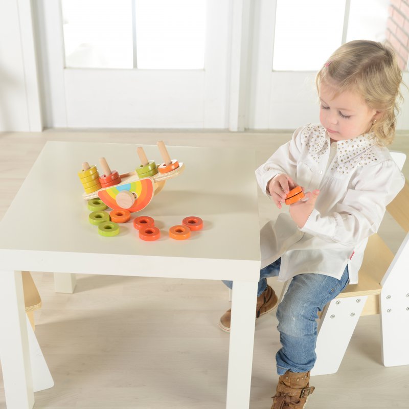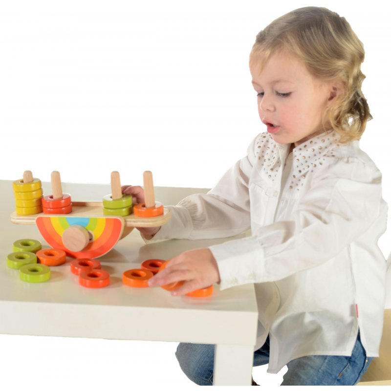 Połączenie drewnianego sortera kolorów, oraz zabawki do balansowania. Fantastyczna zabawkowa tęcza posiada deseczkę z kołkami, na które można nakładać kolorowe pierścienie. Zabawa może polegać na uzyskaniu balansu przy pomocy jednego koloru, wielu kolorów, lub tworząc finezyjne wzory z kolorowych koralików.