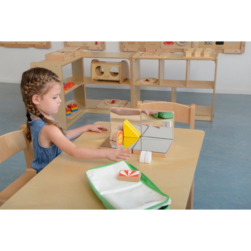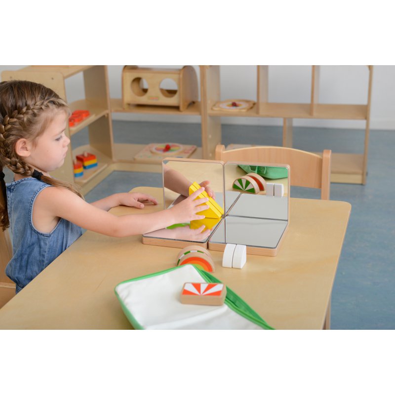 Lustrzana zabawka renomowanego producenta Masterkidz to świetna pomoc edukacyjna podczas lekcji o odbiciach lustrzanych i symetrii. Dzięki czterem drewnianym panelom z lustrami, dziecko może obserwować odbicia przedmiotów na przeróżne sposoby. Na panelach dziecko może układać swoje ulubione zabawki, lub inne przedmioty, które zaproponuje opiekun.