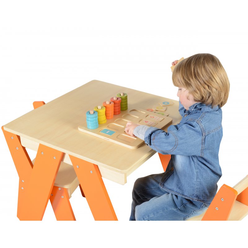 Zabawka składa się z drewnianej tabliczki, w której wycięte zostały otworki na klocki z kolorami i ich nazwami, oraz na klocki z cyferkami, a także 5 kołeczków, na które należy nałożyć kolorowe okrągłe klocki. Zabawka może kompleksowo wspomóc rozwój dziecka, pomagając mu w nauce kolorów i cyferek, oraz poprawiając jego zręczność, oraz koordynację.
