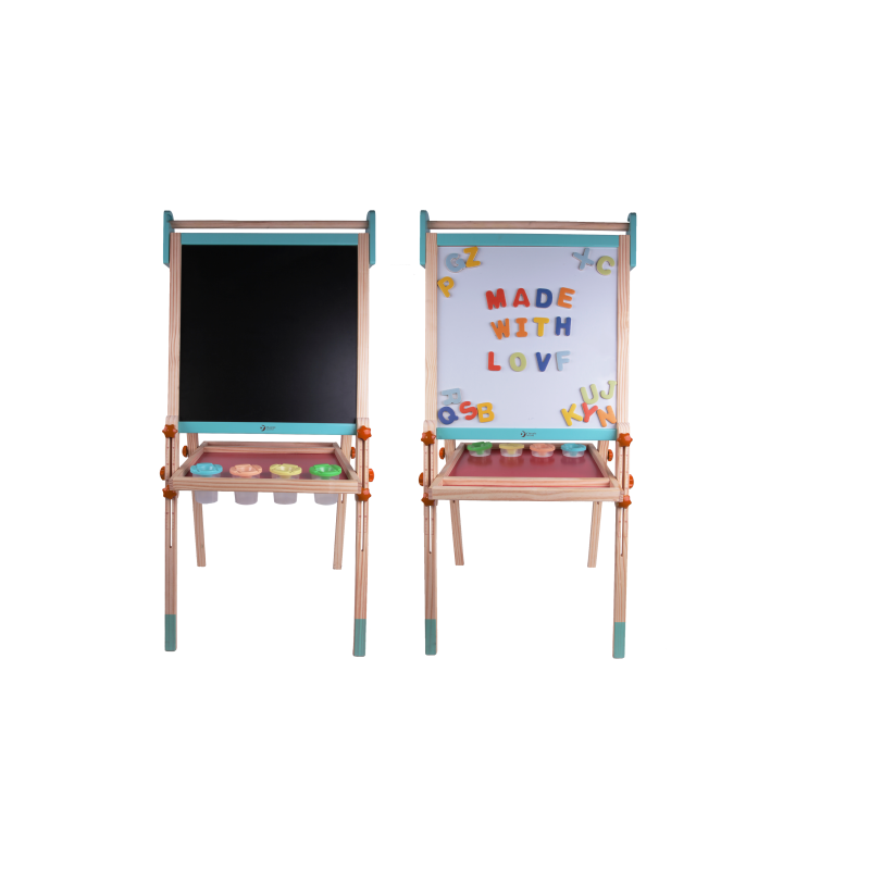 Duża drewniana tablica magnetyczna jest świetną zabawką dla Twoich Pociech. Jest idealnym miejscem na ćwiczenie pierwszych literek, cyferek oraz wspaniałych rysunków. Z jednej strony tablica magnetyczna do pisania markerami, z drugiej tradycyjna tablica kredowa. Strony zmienia się za pomocą obrotu.