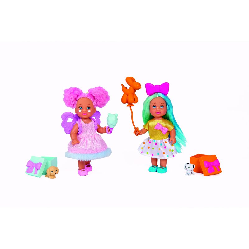 Evi w kolorowych włosach, ubrana w dopasowaną, kolorową sukienkę. Kto jej towarzyszy? Dalmatyńczyk czy Chihuahua? TO NIESPODZIANKA - Przekonaj się po otwarciu pudełeczka, w którym jest on ukryty. Dołączone akcesoria dla pupila.