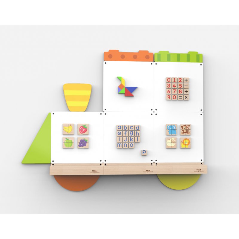 Jedna z całej serii innowacyjnych tablic ściennych, renomowanej firmy Viga. Bazą jest wielofunkcyjna, drewniana tablica, która w zależności od wybranego sposobu nauki, może pełnić funkcję tablicy sucho ściernej lub magnetycznej. Komplet dopełniają magnetyczne klocki i puzzle, którym przypisane są specjalne funkcje oraz zamysł edukacyjny.