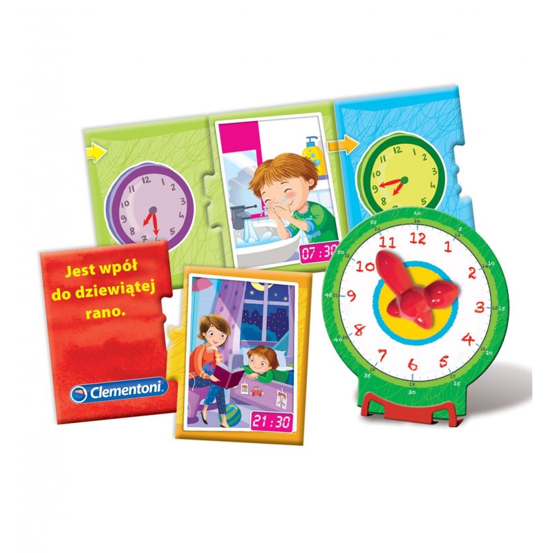 "Która jest godzina?" to fantastyczna zabawka edukacyjna stworzona przez renomowanego producenta zabawek, włoską firmę Clementoni. Gra składa się z elementów-puzzli oraz z dużego zegara i pozwala w przyjemny sposób nauczyć się korzystania z zegarka. Dzięki tej grze dzieci ćwiczą kojarzenie godzin w formacie analogowym a także cyfrowym jednocześnie kojarząc wykonywanie codziennych czynności o konkretnej porze dnia.