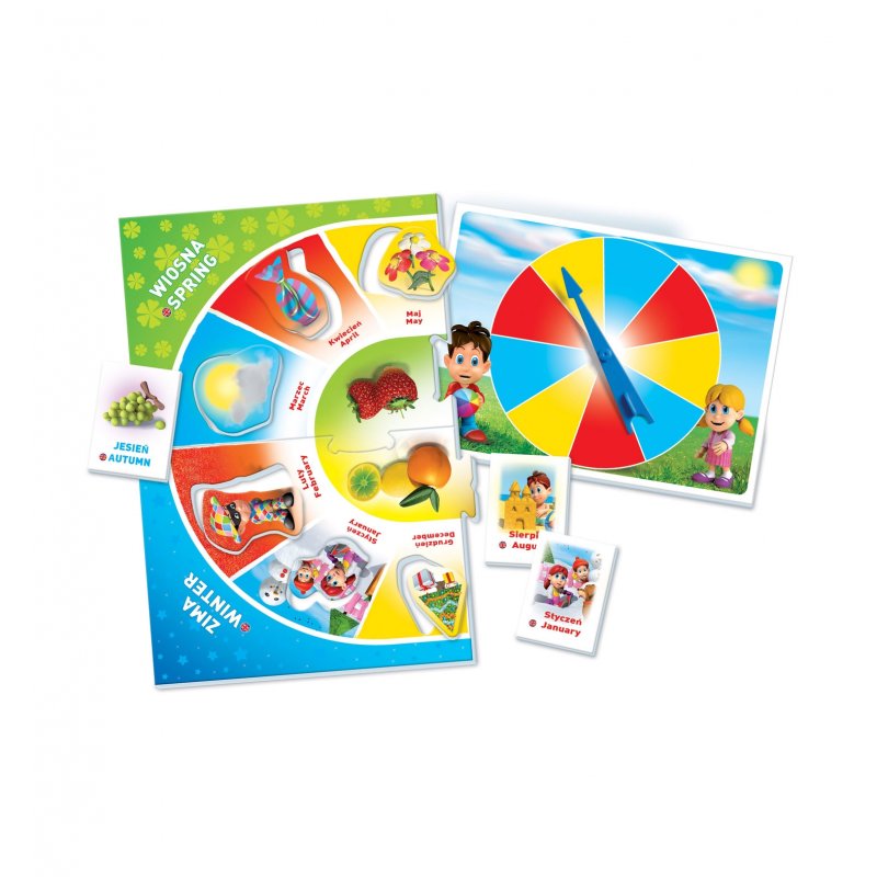 "Miesiące i pory roku" to fantastyczna gra edukacyjna stworzona przez renomowanego producenta zabawek, włoską firmę Clementoni. Ile jest miesięcy i jakie są ich nazwy? Jakie są owoce, przedmioty oraz znamienne momenty charakteryzujące daną porę roku? Dzięki tej grze planszowej dziecko będzie mogło odpowiedziec na te wszystkie pytania rozwijając tym samym istotne dla swojego wieku sprawności. Gra umożliwia także naukę w języku angielskim!