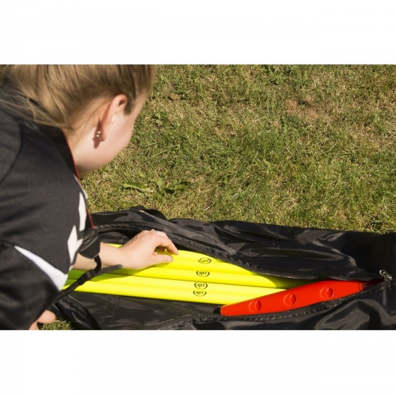 Zestaw dziesięciu pachołków z pięcioma drążkami tworzą idealny zestaw do ćwiczeń. Z zestawu możemy stworzyć tor przeszkód i ćwiczyć siłę swoich mięśni. Aby zmienić poziom trudności, można dostosować wysokość drążków.