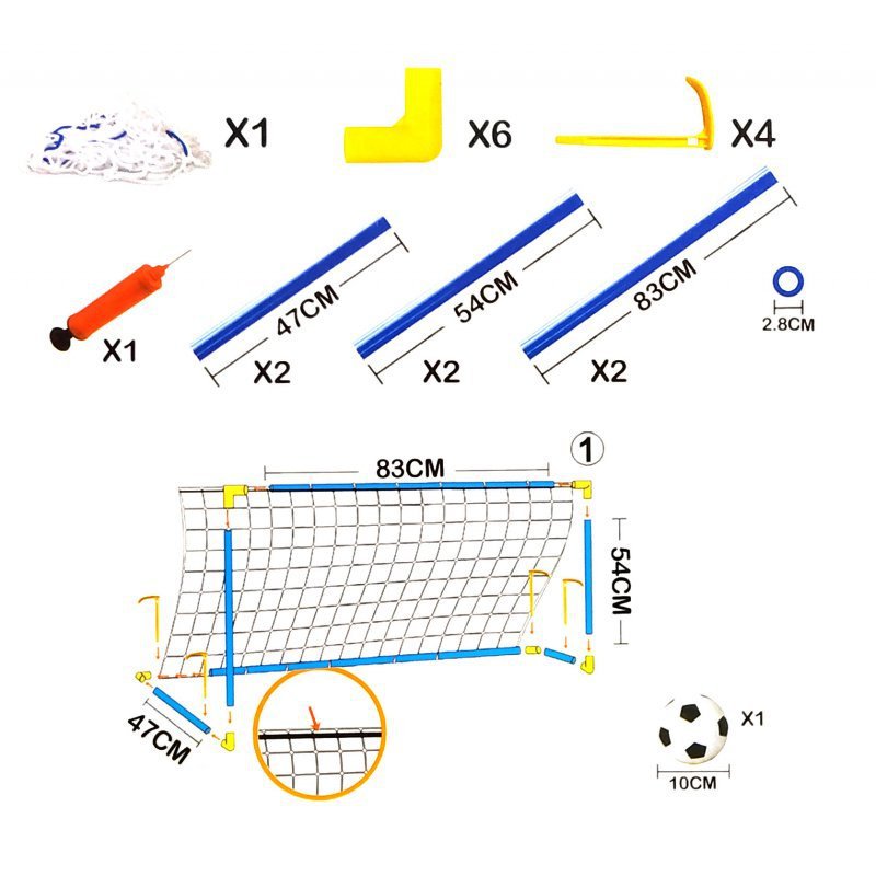 W zestawie znajdują się wszystkie elementy do złożenia bramki. Dodatkowo znajdziemy tu piłkę do gry oraz pompkę.