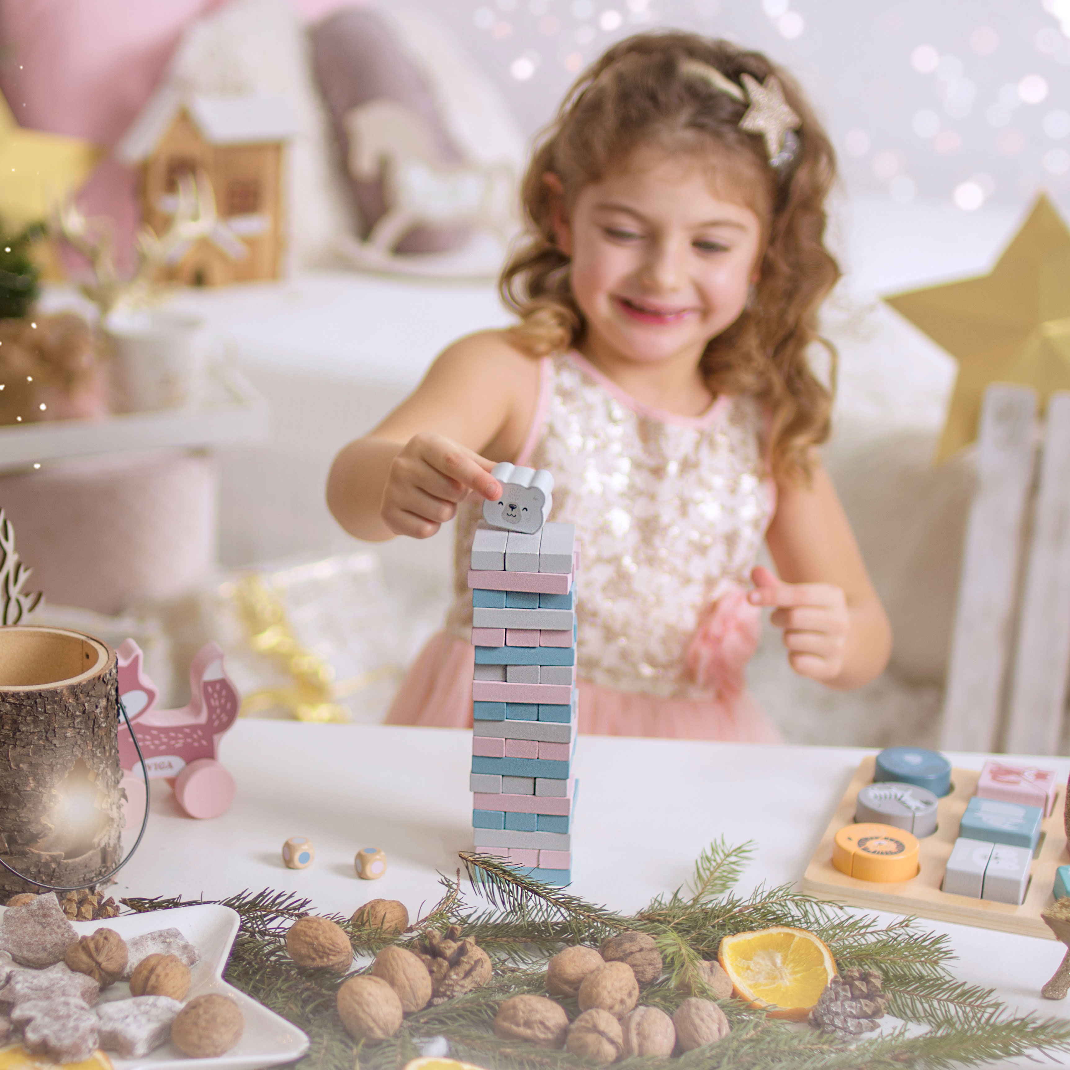 Wieża składa się z ponad 30 elementów. Dorosłym może przypominać popularną grę Jenga. Dzięki temu tworzy możliwość wspólnej zabawy dla całej rodziny. Dziecko może zdecydować, jaki wzór ułoży z klocków. Poza wieżą mogą być to domki, zamki oraz wiele innych, co pozytywnie wpływa na jego wyobraźnie.