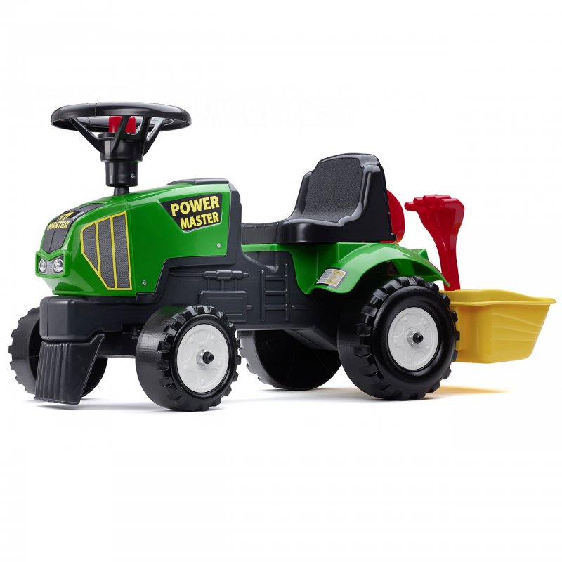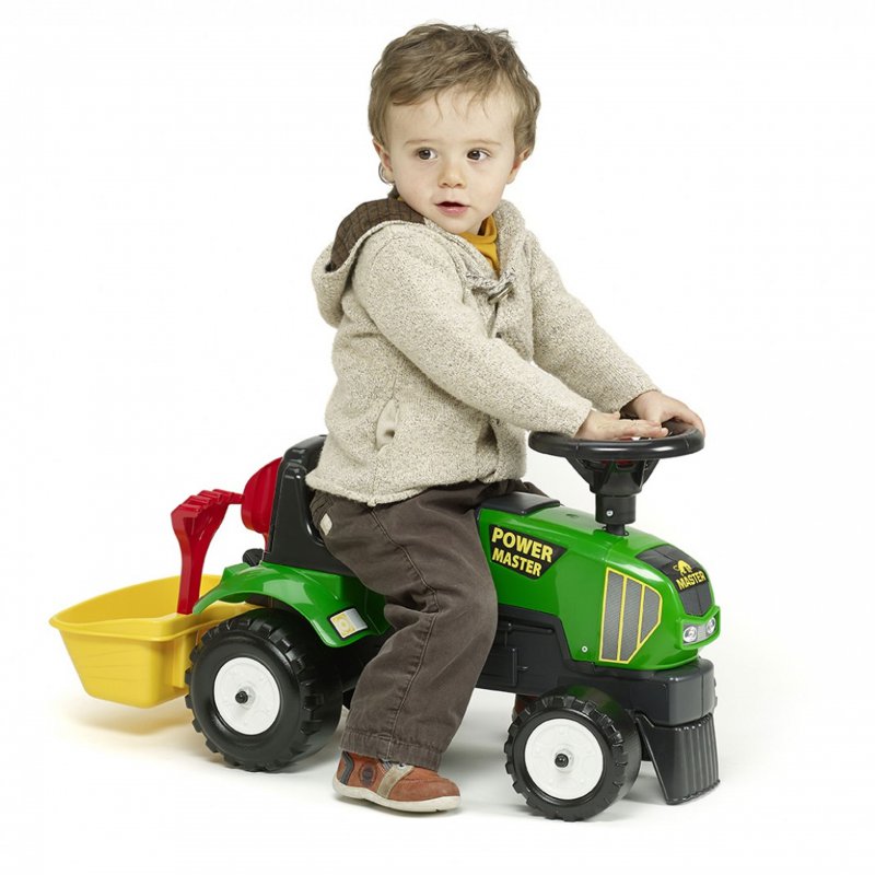 Traktorek chodzik jeździk do odpychania z koszem i zestawem do piasku - łopatką i grabkami.Wykonany z wysokiej jakości plastiku.