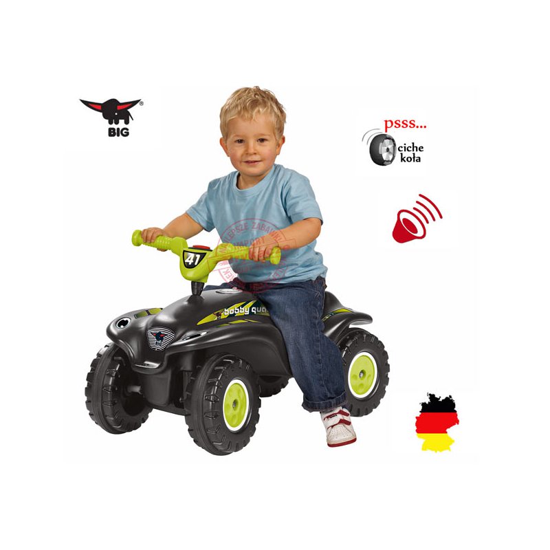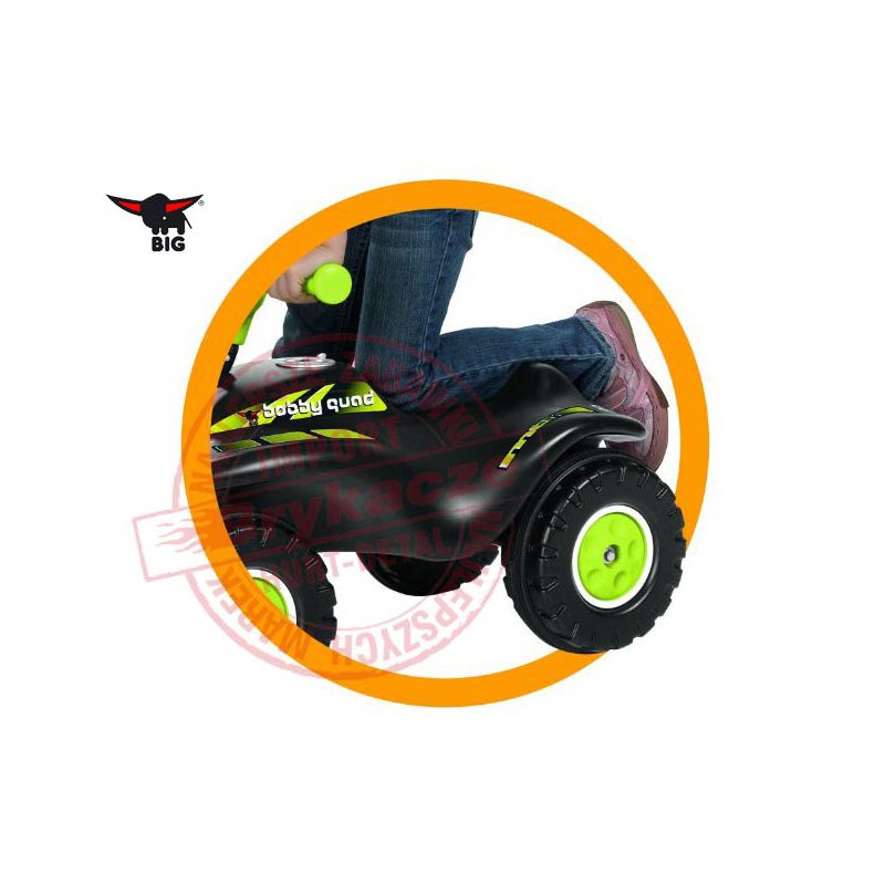 Jeździk Bobby Quad Racing od firmy Big, renomowanego producenta zabawek dla dzieci, to idealny pomysł na prezent dla dziecka. Pojazd przypomina prawdziwy quad. Jest stabilny i bezpieczny. Specjalny profil siedziska pozwala na zabawę w dwóch pozycjach siedząc lub klęcząc na jeździku. Dziecko odpychając się nogami z pewnością będzie się prawidłowo rozwijało i świetnie bawiło. Trwała konstrukcja jeździka, gwarantuje długi okres eksploatacji. Posiada specjalne plastikowe ciche koła, mechanizm holowniczy z przodu, hak na przyczepę oraz klakson. Skrętne koła gwarantują doskonałą przyczepność i sterowność. Dodatkowym atutem jest możliwość doczepienia przyczepki Big Bobby Car, stacyjki lub koguta firmy Big.
