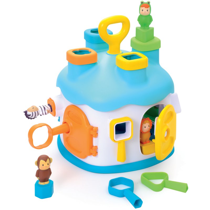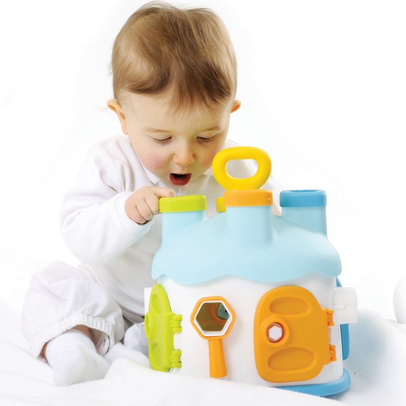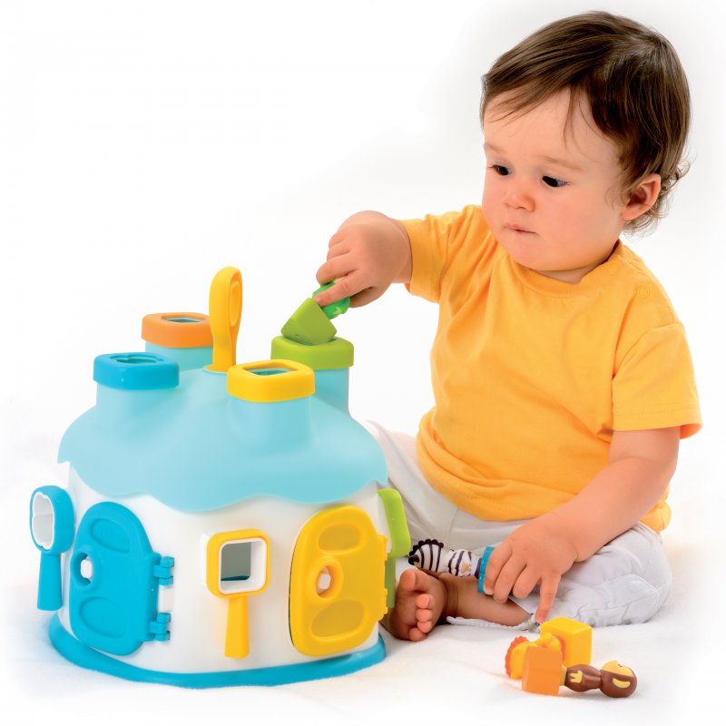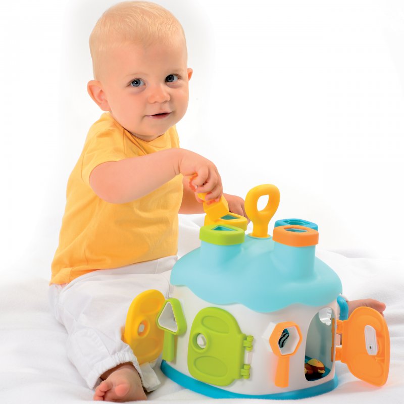 Gdy maluch zaczyna interesować się otaczającym go światem to doskonały moment na wprowadzenie do zabawy sorterów edukacyjnych. Domek posiada 4 różnokolorowe drzwiczki, okienka i kominy. Każde drzwiczki można otworzyć za pomocą klucza w tym samym kolorze, który można również założyć na okienko w odpowiednim kształcie. W zestawie znajdują się także 4 kolorowe klocki z figurkami Cotoons, które także można dopasowywać do kształtów okien i kominów. Na dachu domku umieszczona jest rączka, która ułatwi dziecku przenoszenie zabawki, a podczas przekręcania wydaje klikające dźwięki