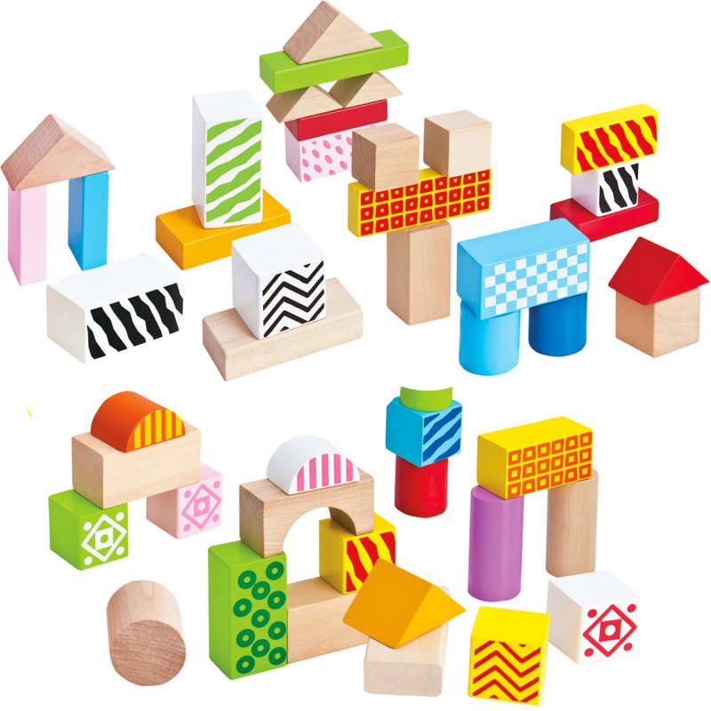 Klocki dzięki swojej formie i wielkości nie zagrażają zdrowiu, a jednocześnie pozwalają na rozwój zdolności manualnych, wyobraźni przestrzennej oraz umiejętności tworzenia pierwszych konstrukcji. Brak ostrych krawędzi, przyjemna w dotyku struktura drewna. Różne kształty i kolory.