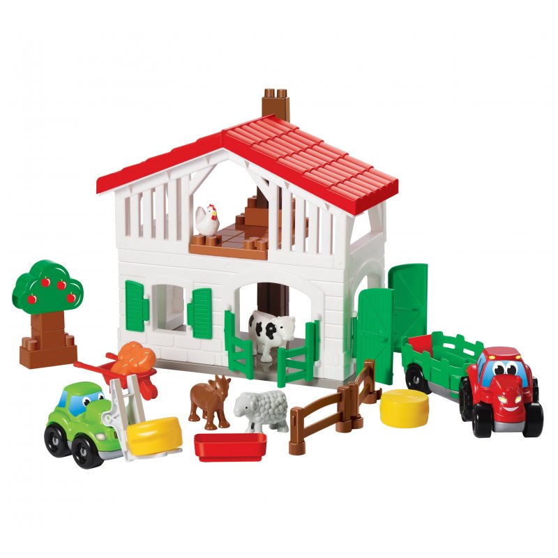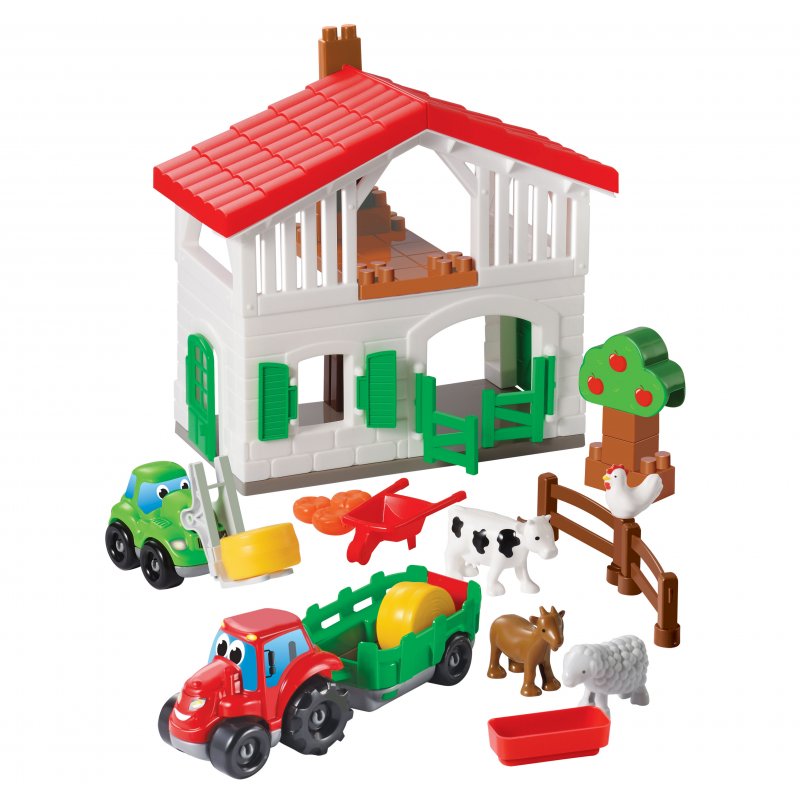 Klocki z serii Abrick Farma Z Autami dla dzieci od 18 miesiąca zawierają wszystkie niezbędne elementy do zbudowania gospodarstwa rolnego. Na farmie dziecko znajdzie także zwierzęta min.kurę,krówkę,owieczkę. Zestaw w sumie zawiera figurki 4 zwierzątek oraz 2 autka (traktor z przyczepą,wózek widłowy). Mali farmerzy będą zachwyceni zabawką.