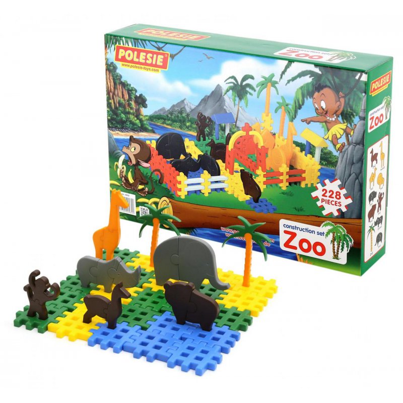 Klocki ZOO to zestaw złożony z 228 elementów. Dzięki niemu nasze dzieci zbudują swoje własne zoo, a w nim: żyrafa, słoń, lew, małpa, nosorożec, lamy, niedźwiedź, wielbłąd, drzewa, palmy, ogrodzenia. Dodatkowe płaskie klocki umożliwiają zbudowanie podłoża, na którym umieszczane są wcześniej wspomniane elementy. Wszystko wykonane jest z najwyższej jakości plastiku, co gwarantuje bezpieczeństwo i trwałość podczas użytkowania. Cały zestaw umieszczono w pudełku, dzięki czemu łatwo zapakować go na prezent.
