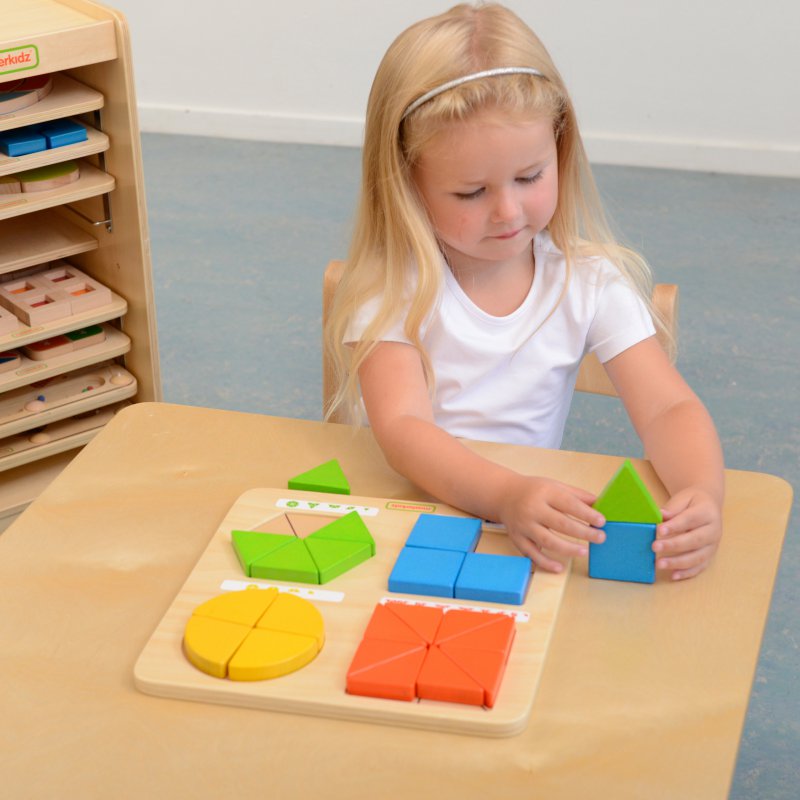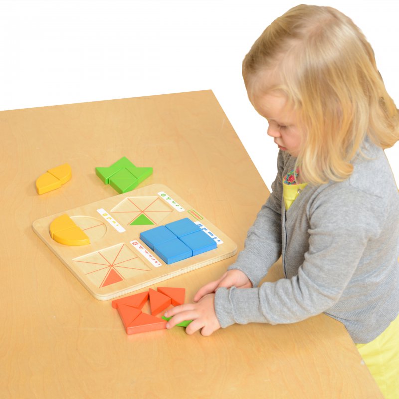 Zestaw drewnianych klocków przedstawiających dobrze znane figury geometryczne. Nie jest to jednak zwykły sorter, lecz kreatywna zabawka, która pozwala dziecku na konstruowanie z mniejszych części dużych figur geometrycznych różnego rodzaju. Mamy w zestawie cztery podstawowe figury: trójkąt prostokątny, kwadrat, trójkąt równoboczny, oraz ćwiartkę koła. Każdy z elementów posiada na drewnianej planszy dedykowane miejsce, które opisane jest możliwymi do stworzenia figurami.