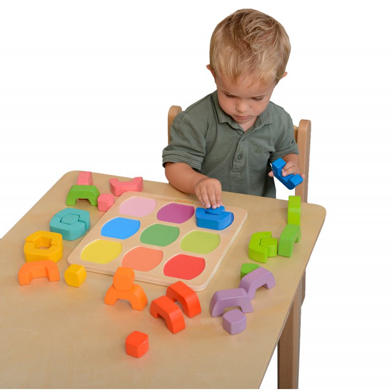 Niecodzienny sorter, który pozwala na zabawę na mnóstwo sposobów. Zestaw składa się z drewnianej tabliczki z miejscami do układania klocków, z zaznaczonymi kolorami, oraz z zestawu 27 kolorowych elementów, z których można konstruować figury.