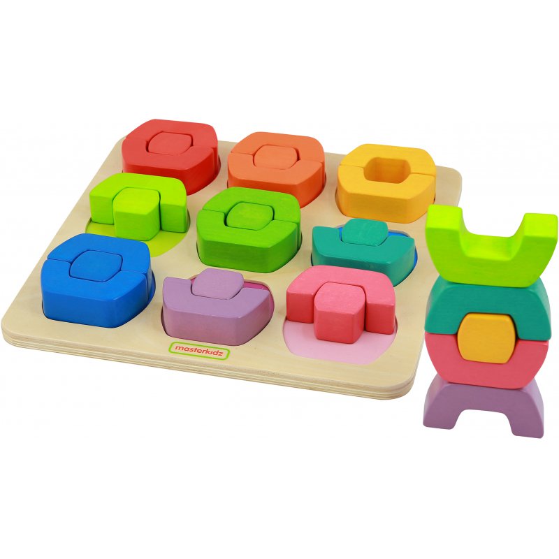 Drewniany sorter kształtów, składający się z trzech trzyczęściowych zestawów klocków, które można układać jeden w drugim, lub w otworach na drewnianej planszy. Klocki są w trzech kolorach, oraz trzech kształtach, dzięki czemu zabawa jest ciekawa i można jej użyć do nauki kolorów i kształtów.