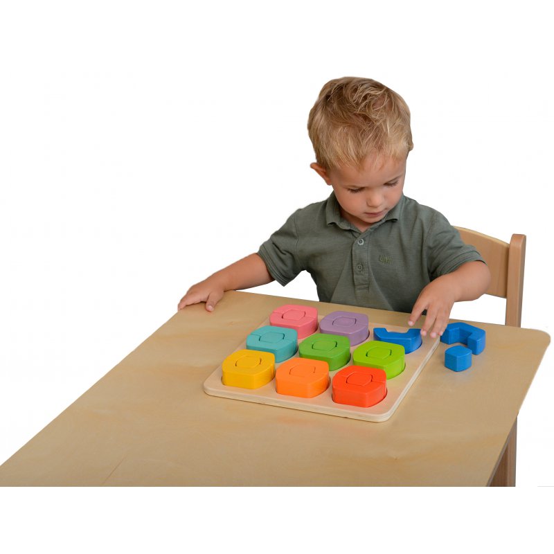 Zestaw składający się z drewnianej planszy, w której wytłoczone zostały otwory na elementy układanki, oraz z kolorowych klocków, które pozwalają na stworzenie niezliczonej ilości kombinacji. Można je układać w przeznaczonych do tego miejscach, lub poza planszą - wtedy dziecko może wykazać się kreatywnością i własną inwencją.