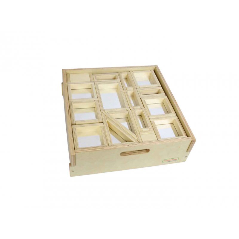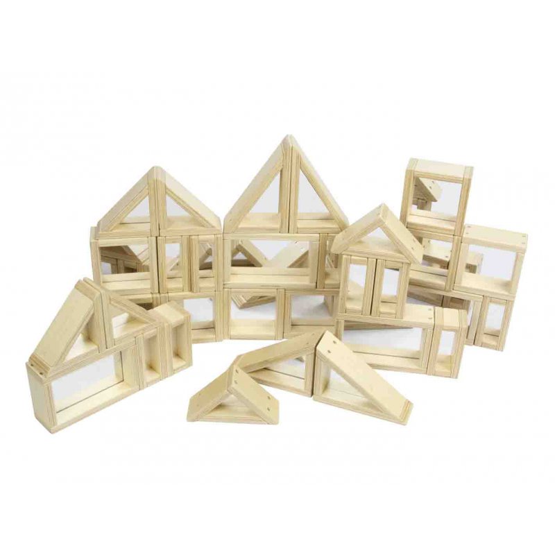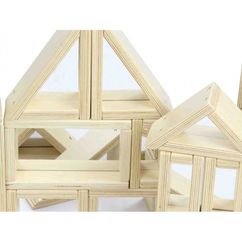 W zestawie znajduje się 31 drewnianych klocków konstrukcyjnych, z których dziecko może zbudować wspaniałe rzeczy. Klocki wyposażone są w małe lustra, która powodują, że zabawka jest niecodzienna i unikatowa. Każde dziecko lubi bawić się odbiciami, dlatego takie klocki sprawiają jeszcze więcej frajdy z zabawy.