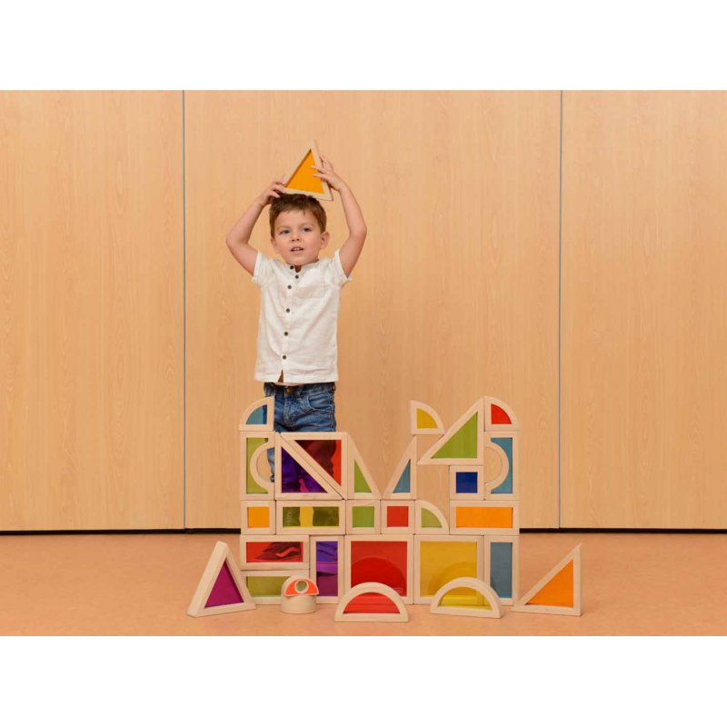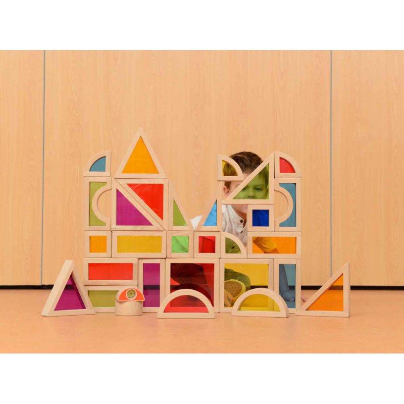 Zestaw niesamowitych klocków z kolorowymi szkiełkami akrylowymi. Drewniane klocki pozwalają na stworzenie cudownych konstrukcji, które będą tym ciekawsze, że będzie można przez nie patrzeć i widzieć kolorowo.