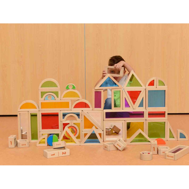 Zestaw niesamowitych klocków z kolorowymi szkiełkami akrylowymi. Drewniane klocki pozwalają na stworzenie cudownych konstrukcji, które będą tym ciekawsze, że będzie można przez nie patrzeć i widzieć kolorowo.