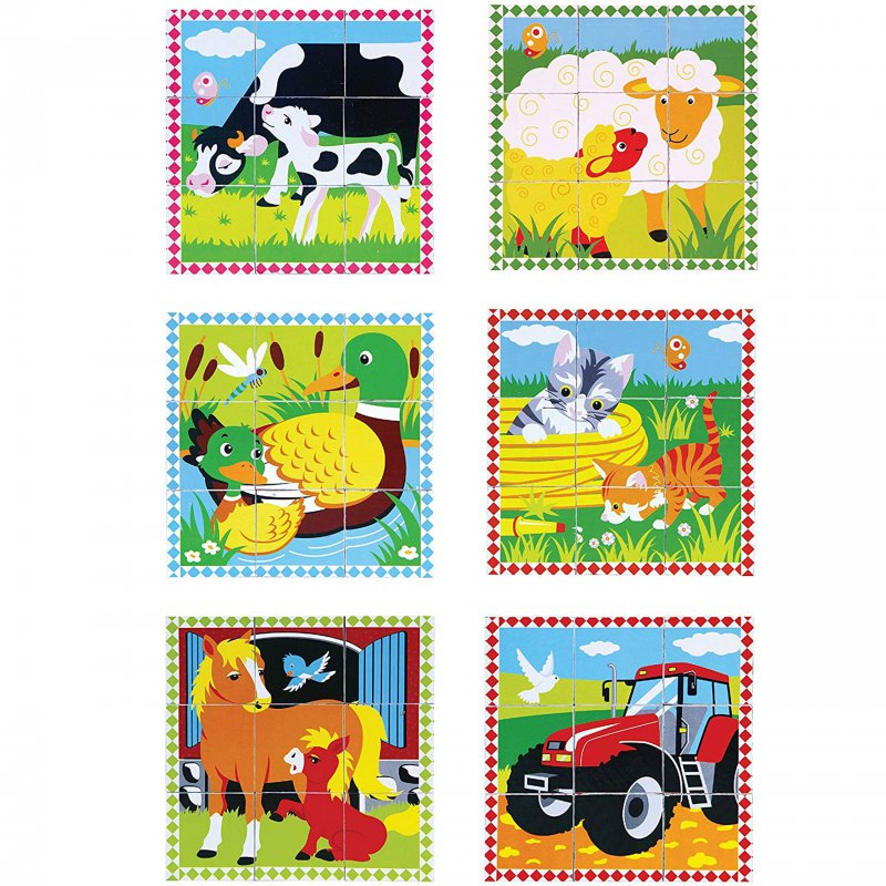 Układanka marki Viga Toys zawiera 6 klocków sześciennych. Każdy z klocków posiada fragmenty obrazków na każdej ze swoich ścianek. Pozwala to na ułożenie 6 obrazków. Klocki zostały wykonane z drewna, oraz pomalowane nietoksycznymi farbami. Są całkowicie bezpieczne dla dzieci.