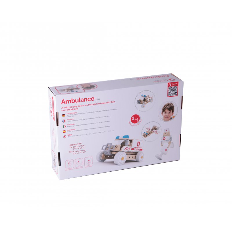 Drewniany zestaw konstrukcyjny marki Classic World to świetna zabawka dla dzieci w wieku od 3 lat. Pozwala na rozwijanie swojej kreatywności poprzez wymyślanie nowych wzorów ambulansu. Zestaw pozwala na zbudowanie kilka wariantów pojazdu wg wzorów w książeczce, lub tworzenie ich wg swojego pomysłu.