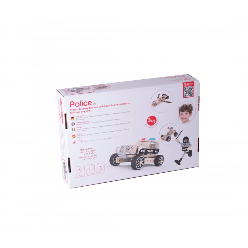 Wspaniała zabawa w policję! Zapewnij bezpieczeństwo w zabawkowym miasteczku dzięki policyjnemu zestawowi, który zawiera drewniany wóz oraz figurkę policjanta. Pojazd składa się z drewnianych elementów konstrukcyjnych, z których można budować na wiele sposobów. Kreatywny zestaw 3w1 rozwija umiejętności motoryczne i zapewnia wiele godzin wspaniałej zabawy! W naszej ofercie znajdziesz także inne pojazdy Classic World.