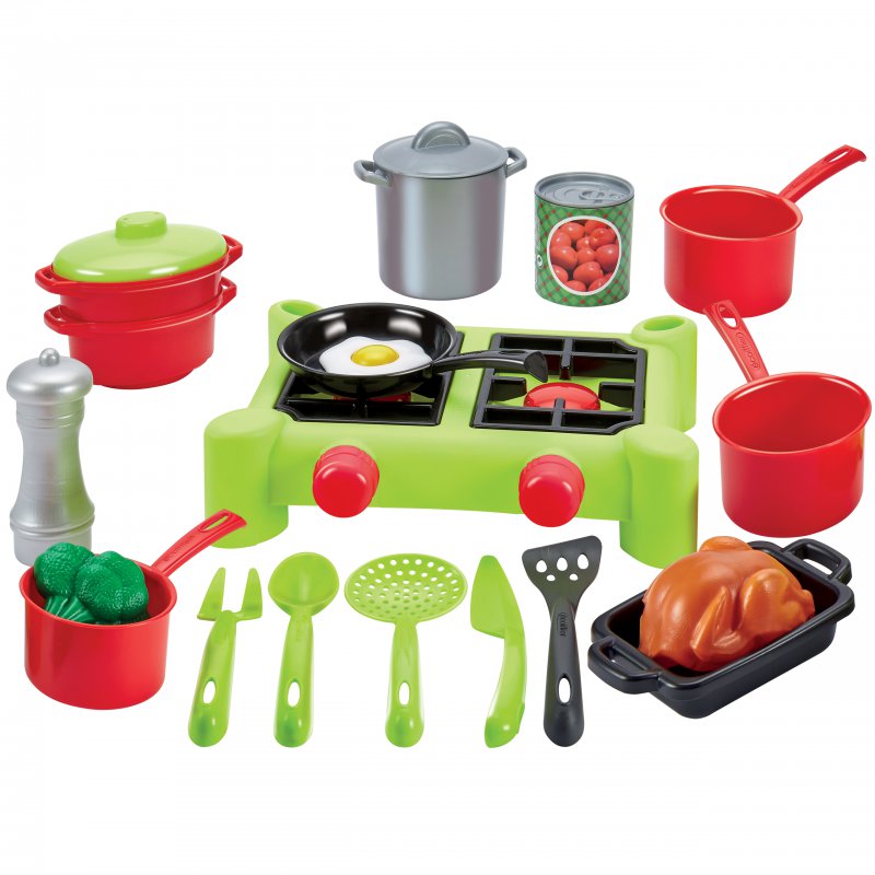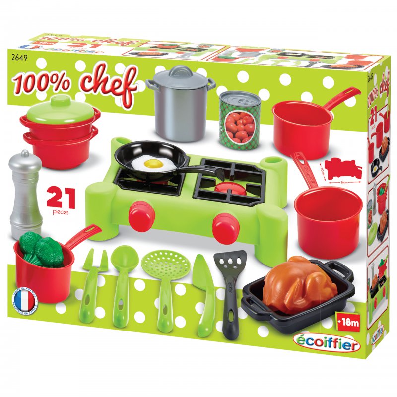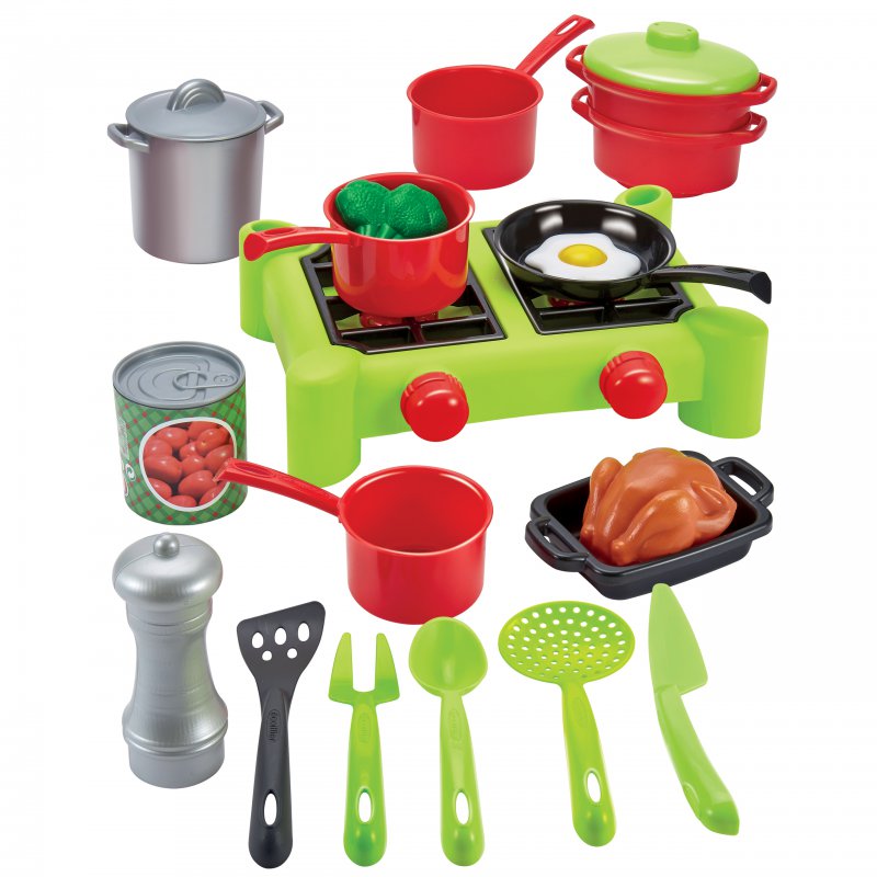 Zestaw naczyń obiadowych oraz artykułów spożywczych z zestawie z kuchnią dwupalnikową od firmy Smoby Ecoiffier, cenionego producenta zabawek dla dzieci, będzie stanowił idealne uzupełnienie akcesoriów każdej kuchni.