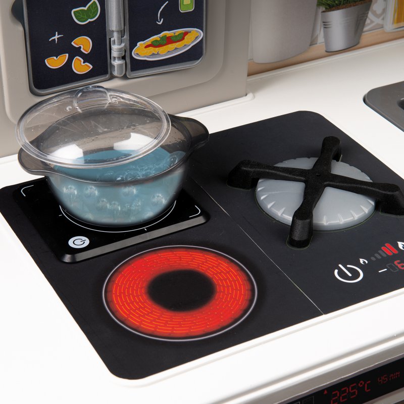 Wielofunkcyjna kuchnia dla dzieci z regulacją wysokości, płytą grzewczą z dźwiękami gotowania oraz funkcją Magic Bubble - wystarczy wlać wodę do garnka i postawić na palniku a woda zacznie bulgotać.