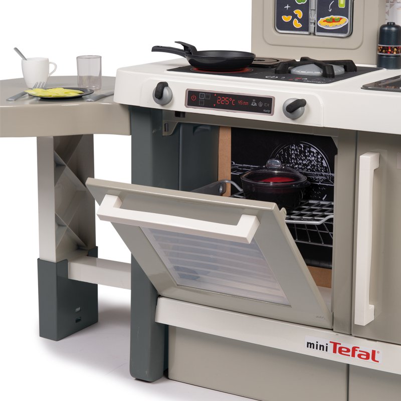 Kuchnia Tefal Evolutive z dźwiękami gotowania oraz magicznym garnkiem z bąbelkami została wyposażona w 40 dodatkowych akcesoriów takich jak: talerze, sztućce, filiżanki, szklaneczki, kapsułki do ekspresu, patelnie, garnek oraz artykuły spożywcze.