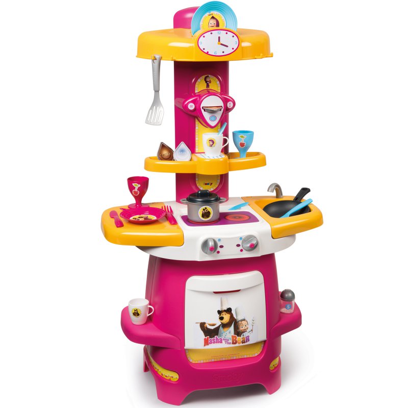 Kuchnia dla dzieci posiada ciekawy i nowoczesny design, a także ładną i żywą kolorystykę, nawiązująca do gamy barw charakterystycznych dla niesfornej Maszy i opiekuńczego Niedźwiedzia sprawiają, że dzieci będą uwielbiały bawić się tą kuchnią. Mali kucharze znajdą tu 2 "palniki gazowe", półeczki na przyprawy na wspornikach pochłaniacza, jedną półkę łącząca wsporniki. Na pochłaniaczu znajdują się haczyki, na których można powiesić sztućce, panel, na którym znajduje się zlewozmywak z kranem. Rewelacja mamy rozsuwany blat i zlew.