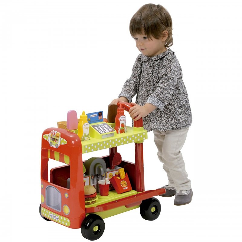 Rewelacyjny Food Truck od firmy Ecoiffier. Wózek z jedzeniem na szerokich kółkach jest stabilny, a dodatkowo, dzięki uchwytowi, można go wygodnie prowadzić. Boki wózka można obniżyć tak, by odsłonić i pokazać klientom, co znajduje się w środku.