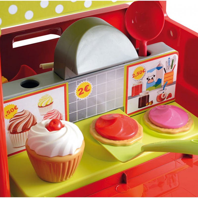 Zestaw zawiera niezbędne wyposażenie, takie jak hamburgery, lody, frytki, napój i inne produkty spożywcze, a dodatkowo także zabawkową kasę, łyżkę do lodów i automat do nalewania napojów, czyli wszystkie akcesoria niezbędne do prowadzenia własnego biznesu na kółkach! Zabawka rozwinie wyobraźnię maluchów i dostarczy im mnóstwo radości.