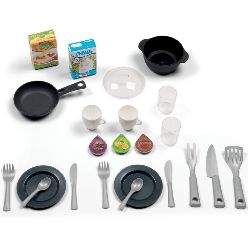 Kuchnia miniTefal Studio francuskiej firmy Smoby. Elektroniczna kuchnia z dźwiękiem - odgłosem gotowania, z garnkiem z makaronem, z rybką i kotletem usmażonymi z jednej strony, talerzykami, sztućcami, kubeczkami. W zestawie 27 elementów. Elektroniczna kuchnia dla dzieci lubiących naśladowanie rodziców