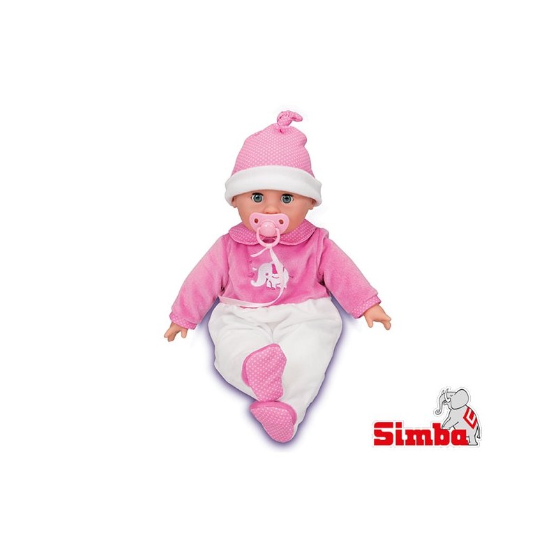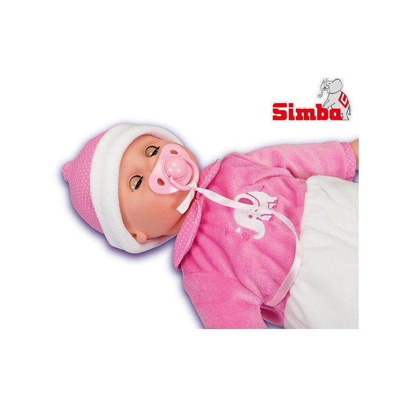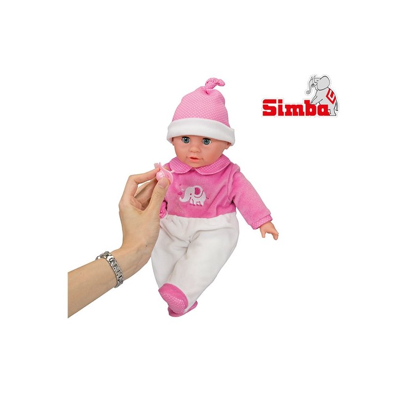 Śliczna lalka gaworząca z firmy Simba wydaje z siebie aż 24 dźwięki. Potrafi dopominać się uwagi płaczem, mówić mama i wydawać wiele innych dźwięków absorbujących uwagę dziecka. Po włożeniu smoczka do buzi lalki możemy usłyszeć odgłosy jedzenia,lalka robi się śpiąca,zasypia,a w tle rozlega się przepiękna kołysanka. Wykonana z miękkiego i przyjemnego materiału w kolorze różowym oraz dobraną kolorystycznie czapeczkę. Stworzona jest aby mała mamusia mogła ja przytulać i opiekować. Lalka posiada zamykane oczka,a w zestawie znajduje się smoczek.