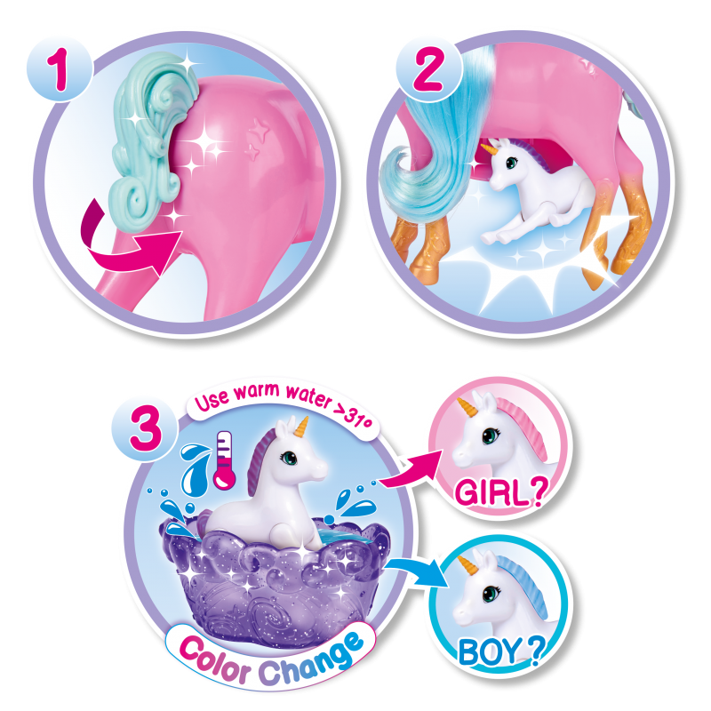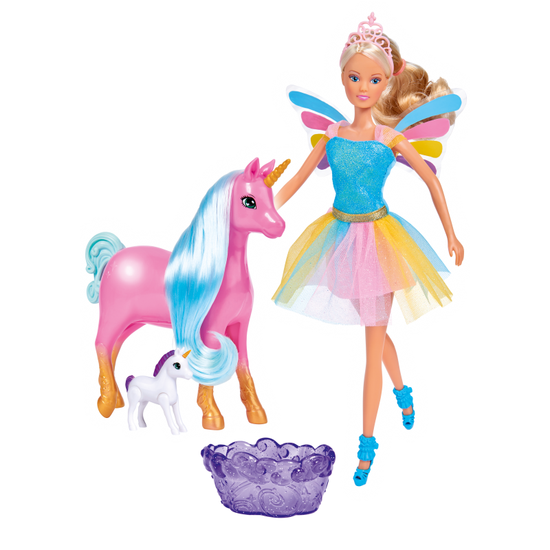Steffi jako wróżka z jednorożcem w ciąży, wystarczy przyciągnąć do siebie ogon jednorożca, a z jego brzucha wypadnie jednorożec-noworodek. Dodatkowa funkcja zabawy - płeć jednorożca-noworodka jest niespodzianką a jego grzywa zmienia kolor. Aby poznać jego płeć, należy umieścić go w dołączonej wanience, polać ciepłą wodą i przekonać się, jakiego koloru będzie jego grzywa, różowego czy niebieskiego.