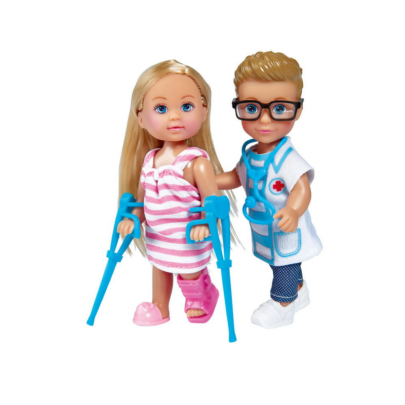 Laleczka z długimi, blond włosami, w sukience w różowo-białe paski i jednym bucie, trafiła na ostry dyżur ze złamaną nogą. Doktor Timmy ubrany w spodnie i bluzkę lekarską, założył gips na nogę Evi i zalecił chodzenie o kulach ortopedycznych aż do całkowitego wyleczenia. Zestaw zawiera dwie laleczki, akcesoria medyczne w sumie 10 elementów.