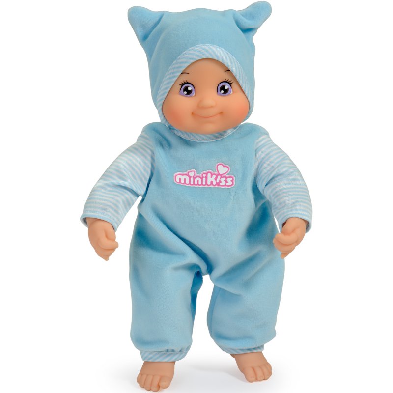 Nowa lalka z serii mini Kiss od renomowanej francuskiej firmy Smoby przeznaczona dla dzieci od 1 roku zycia. Śliczna laleczka o niebieskich oczach w niebieskim ubranku oraz słodkiej czapeczce zauroczy nie tylko dziecko ale i rodziców. Głowka, rączki i nóżki wykonane są z tworzywa, natomiast brzuszek jest materiałowy. Może pełnić funkcję przytulanki, ukochanej towarzyszki pomagającej zasnąć. Gdy naciśniemy brzuszek ta da Nam buziaka. Idealna zabawka dla każdej dziewczynki, która chce poczuć się jak prawdziwa mama.