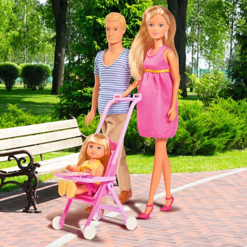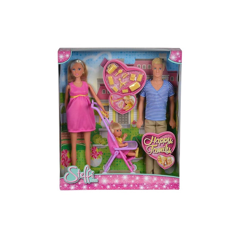 Lalka Steffi w ciąży z dzieckiem oraz Kevinem tworzą szczęśliwą rodzinę. Zapraszamy w magiczny świat Steffi, jak zawsze pełen kolorowych strojów oraz przesympatycznych gadżetów. Prześliczna Lalka Steffi niemieckiej firmy Simba stanie się towarzyszką codziennych zabaw każdej małej dziewczynki. Wasze pociechy zaczną tworzyć nieskończoną ilość opowiadań o Steffi i jej przygodach, co zachęci do wyobrażania i udoskonalania scenek z życia małej przyjaciółki. Szczęśliwa rodzina to zestaw, w którym dziewczynki znajdą wyjątkową lalkę Steffi oczekującą narodzina maleństwa. Wewnątrz jej brzuszka znajduje się malutkie niemowlę. Wystarczy nacisnąć na brzuch aby dotrzeć do maleństwa. Towarzyszem Steffi jest Kevin a wózeczku spacerówce dołączonego do zestawu mamy ich słodką córkę Evi.