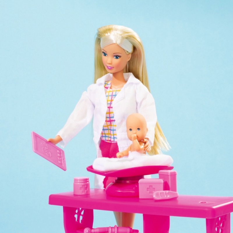 Lalka Steffi pediatra, niemieckiej firmy Simba, to doskonały prezent na każdą okazję. Laleczka, ubrana jest w modne ubranko oraz w fartuchu lekarski. Steffi ma pod swoją opieką bliźnięta, bobasy owinięte są w miękkie pieluszki. Zaraz po urodzeniu maluchy należy zważyć i zbadać dlatego do wykorzystania mamy wanienkę oraz wagę dla maluchów.