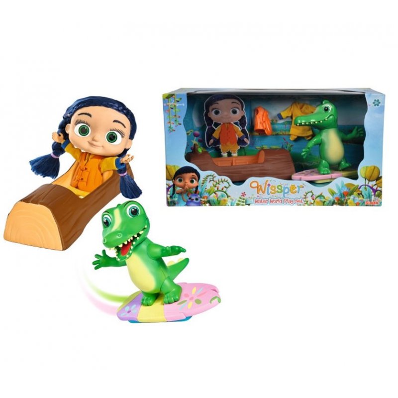 Wissper świat wodny zestaw z figurką: Aligator Kev (wysokość 17 cm), deska surfingowa z kółkami i napędem dla Kev’a, strój, kapok, buty dla lalki 23 cm, kanoe z pnia drzewa na kółkach dla lalki 23 cm