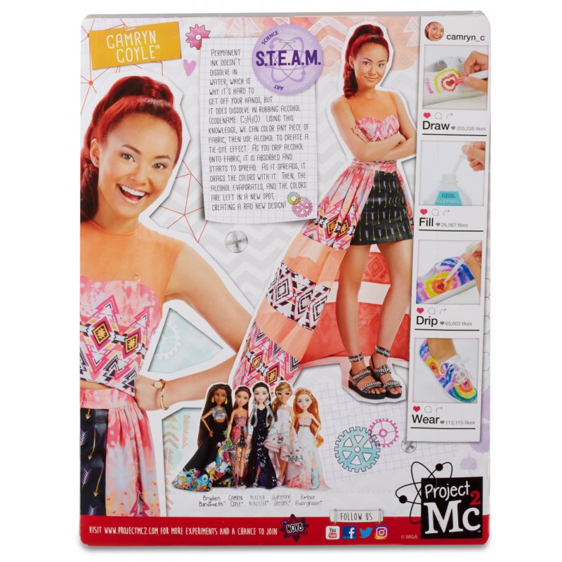 Project MC2 niezwykła seria lalek oraz akcesoriów, które idealnie wpisują się w potrzeby współczesnych dziewczynek.Linia oferuje dziewczynkom możliwość wykonywania inteligentnych doświadczeń naukowych. Baw się i eksperymentuj,przenieś się z bohaterkami popularnego serialu do świata nauki i zabawy.Te sześć niezwykłych dziewczyn o różnorodnej urodzie, zdolnościach i temperamencie, pomogą odnaleźć Twoją bratnią duszę. McKeyla McAlister jest pisarką, hipsterką i wytrawnym szpiegiem. Gdy nie pisze - to czyta powieści Conan Doyle'a albo ratuje świat! Adrienne Attoms z kolei to kulinarny chemik, w jej zyłach płynie hiszpanska krew i uwielbia wyprawiać przyjęcia! Bryden Bandweth to absolutnie digitalgirl! Tweetuje, uwielbia muzykę i bawi się fotografią cyfrową. Camryn Coyle to niezwykle inteligentna postać, a w jej garażu powstają najciekawsze przedmioty. Chętnie pokaże ci swoją podrasowaną deskorolkę! Devon D’Marco jest wyjątkową artystką, która udowodni ci, że sztuka ma wiele wspólnego z nauką. Z kolei Ember Evergreen wychowała się na farmie, a rośliny to jej wielka pasja. Z nimi nie grozi ci żadna nuda!