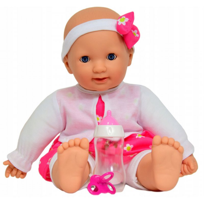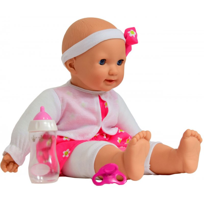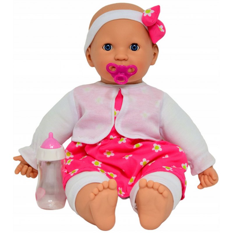 W zestawie z lalką znajdziemy buteleczkę i smoczek. Lalka ubrana jest w różową tunikę, biały sweterek i białe legginsy. Na głowie ma białą opaskę z różową kokardką.