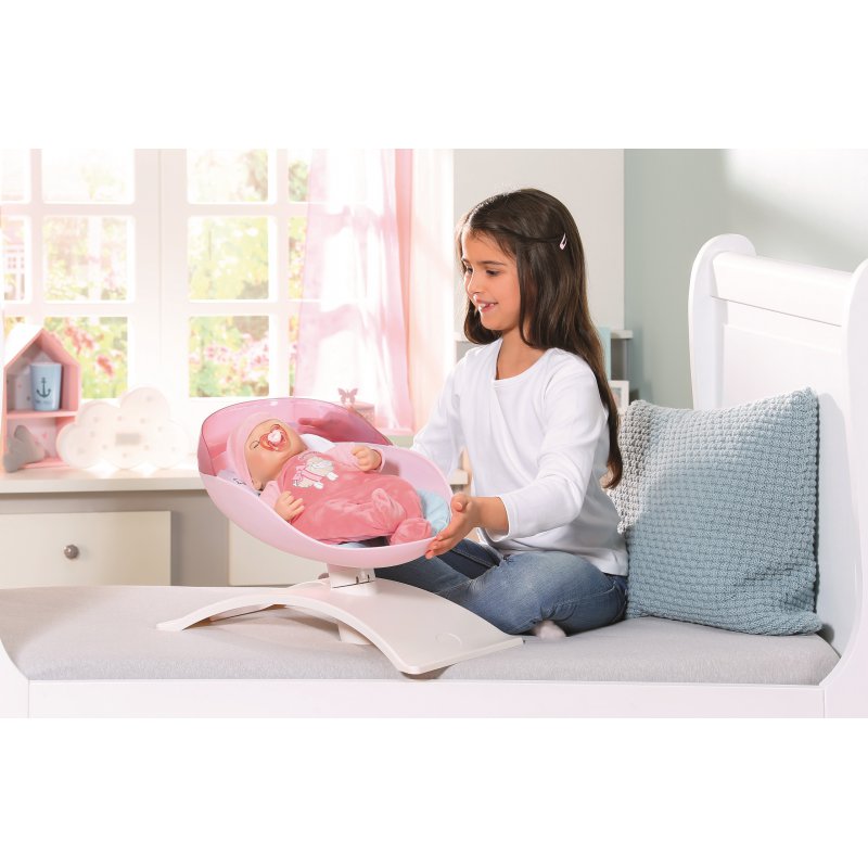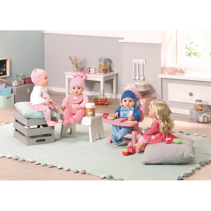 Cudowna zabawa "w mamę" z uroczą lalką Baby Annabell! Przez większość czasu Baby Annabell jest szczęśliwa i gaworzy w swoim dziecięcym języku. Czasem po piciu odbije się jej, ale może się zdarzyć, że zacznie płakać z powodu bólu brzuszka i w takiej sytuacji należy delikatnie poklepać jej plecki. Jeśli położysz lalkę i łagodnie pogłaszczesz ją po czole, laleczka stanie się śpiąca i zacznie ziewać.
