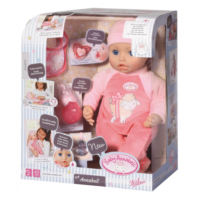 To dziewczynka, która nazywa się Baby Annabell. Lalka wygląda prawie jak prawdziwe dziecko i ma bardzo realistyczne funkcje. Reaguje na dotknięcia, może płakać prawdziwymi łzami oraz uwielbia swoją butelkę! Oczywiście jak małe dziecko, lalka potrzebuje bardzo dużo snu. Jeżeli zaczniesz delikatnie ją kołysać na ramieniu lub w kołysce, lalka Baby Annabell zamyka oczy i powoli zasypia.