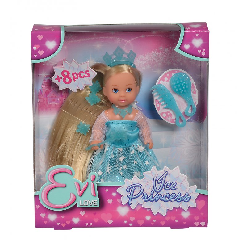 Laleczka Evi jako księżniczka z długimi włosami, w błyszczącej koronie, W zestawie: naszyjnik, grzebyk, spinki do włosów, berło, 12cm